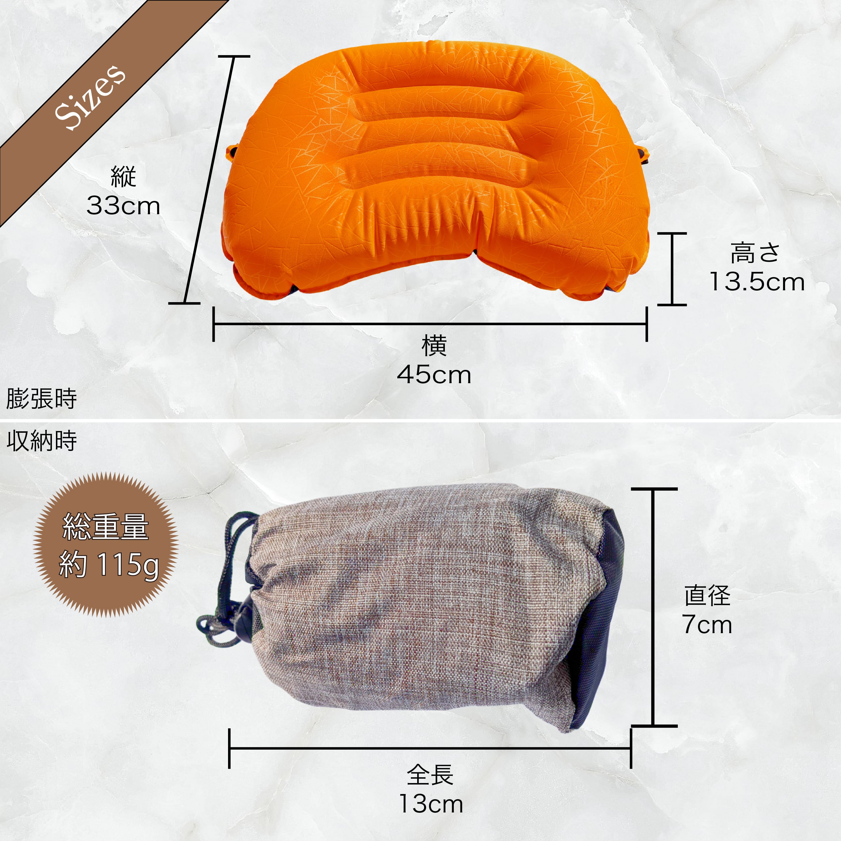 - サイズ: 膨らませた状態 450mm x 330mm x 135mm、収納時 130mm x 70mm x 70mm