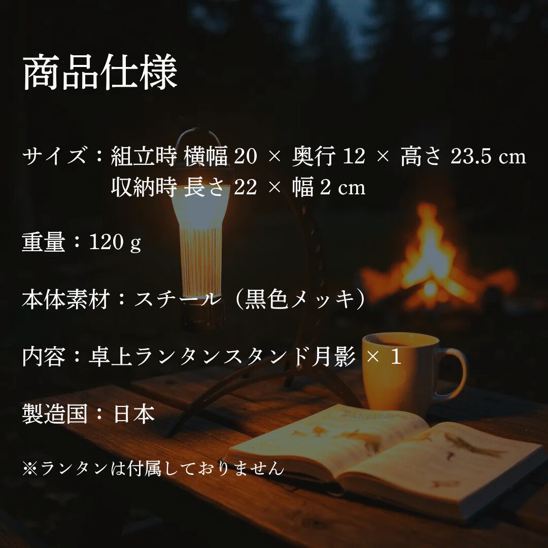 卓上ランタンスタンド 月影~Tsykikage~は、優雅なデザインと高い機能性を兼ね備えたアイテムです。キャンプやホームパーティー、リラックスタイムにぴったりなこのスタンドは、どんなシーンにも調和し、優しい光で空間を彩ります。月の満ち欠けを模したデザインは、見る人を魅了し、心を落ち着かせてくれます。